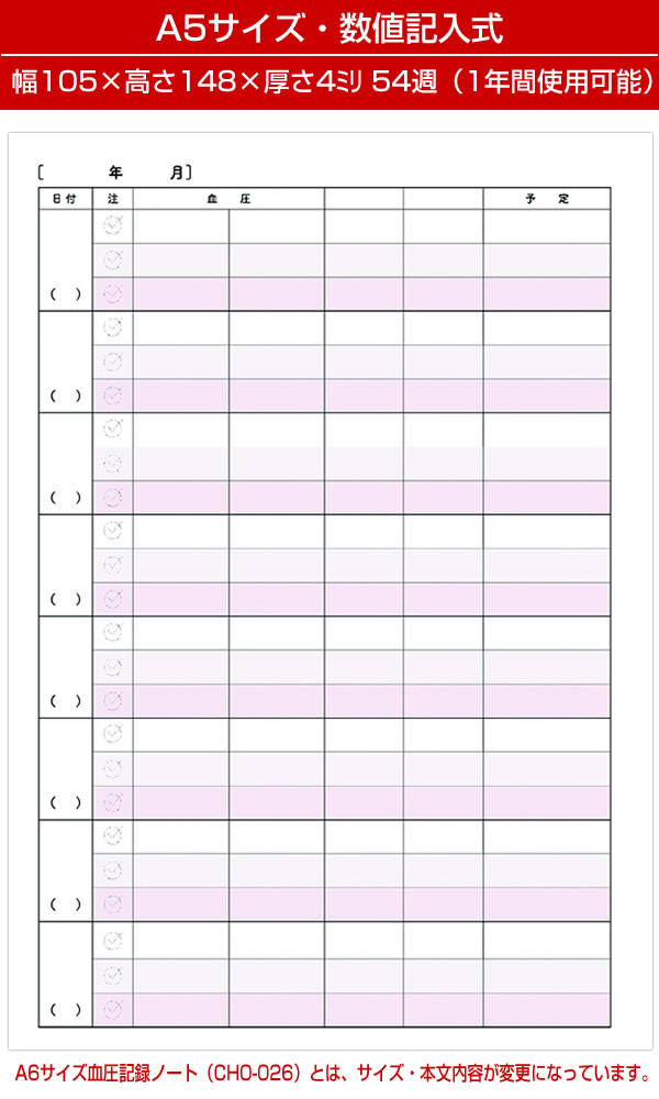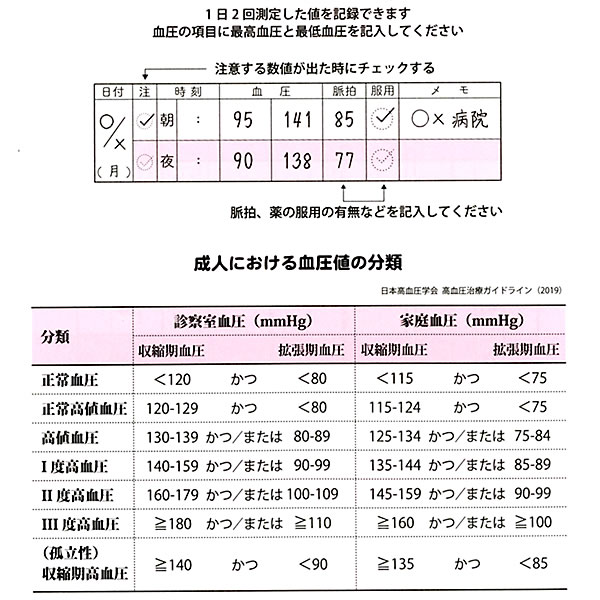 ◇記入項目:血圧(数値)、印(注意すべき数値の場合)、任意(1)(2)、日付・予定。