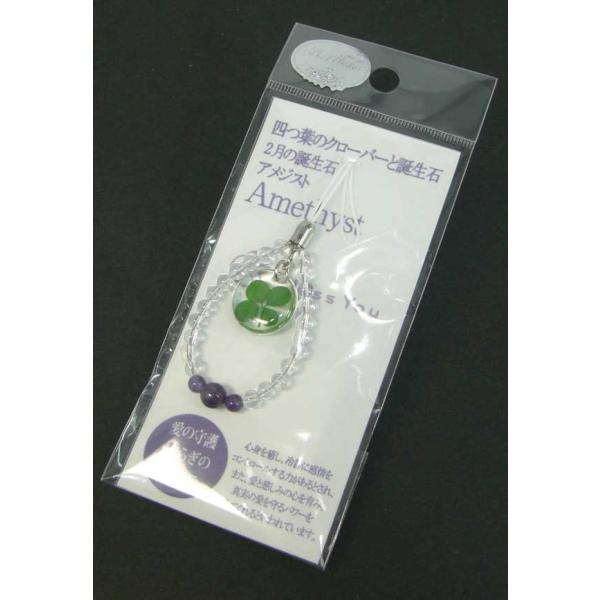 四葉のクローバーと誕生石のストラップ 2月 アメジスト AHA7002 幸運のアイテム ラッキーアイテム 天然四つ葉を使用 ART-HOP アートホップ