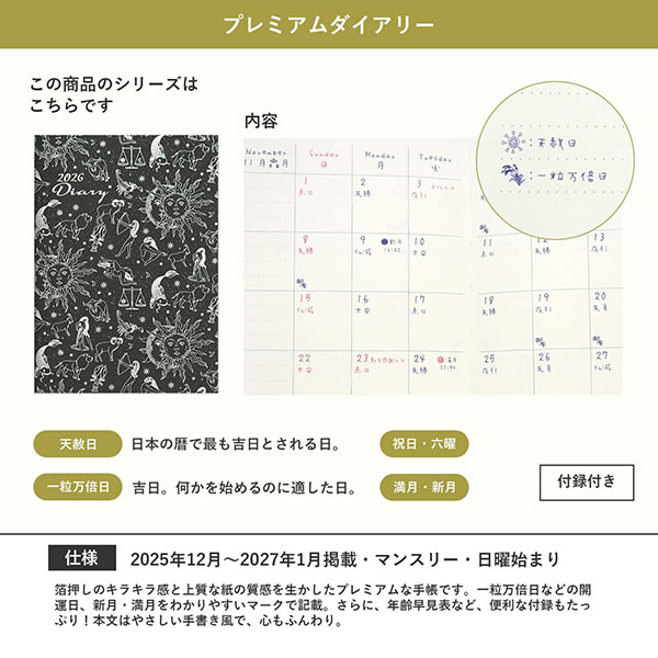 ◇仕様:月間ブロック見開き1ヶ月、日曜始まり、天赦日や一粒万倍日、祝日・六曜、満月・新月入り