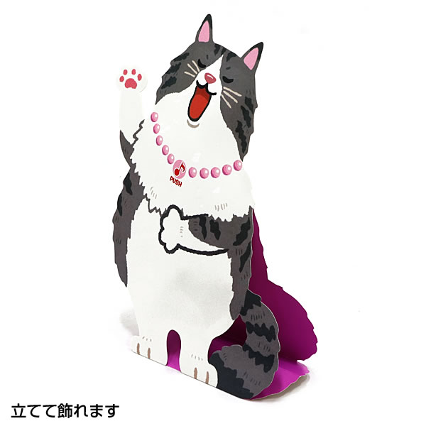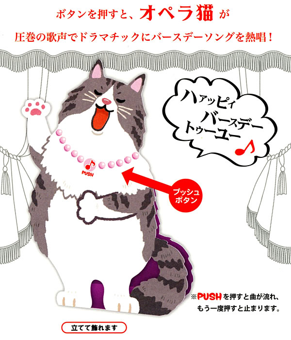 長毛種の猫がオペラ歌手になりきって熱唱。ドイツ声楽を学んだ歌手による本格的なオペラ調バースデーソングが流れます。メッセージ用のミニカード付きで、音楽好きや猫好きの方へ驚きと感動を届ける一枚です。