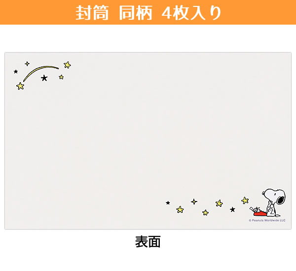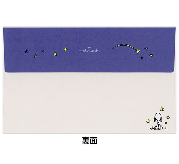 タイプライターを打っているスヌーピーと、流れ星が振る瞬間を切り取ったストーリー性のあるデザインの便箋と封筒のセット。