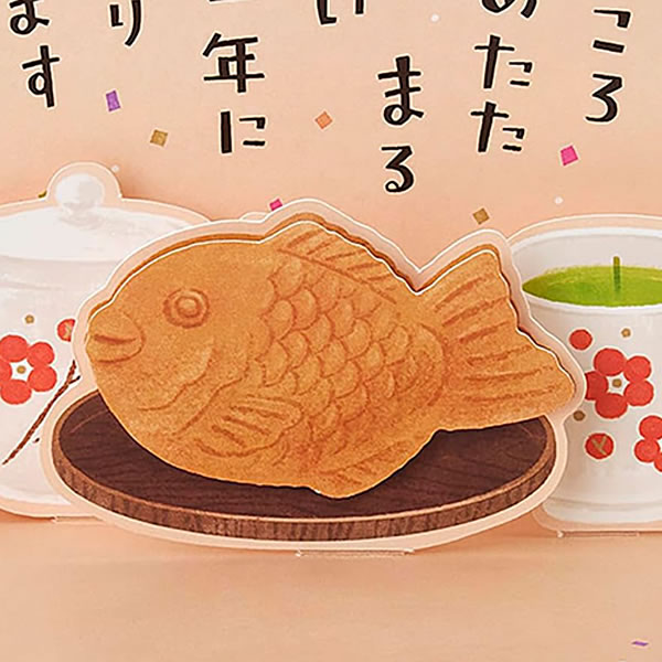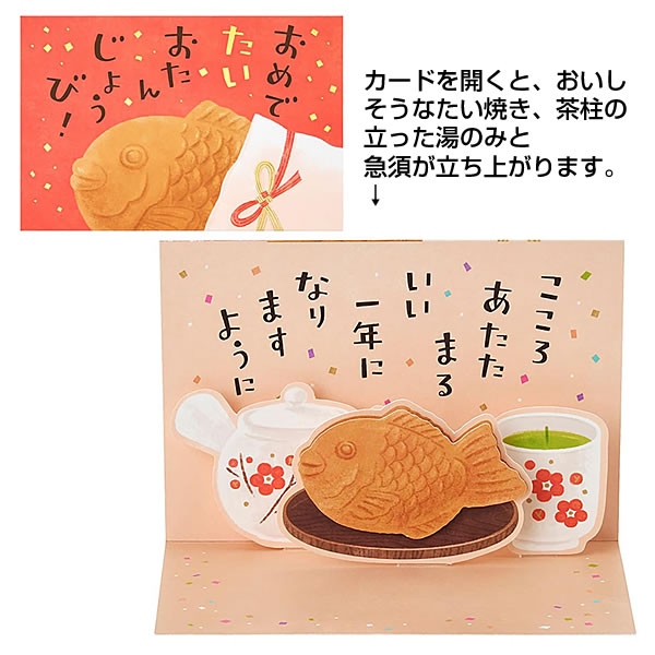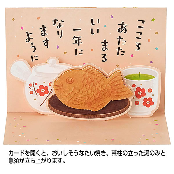 カードを開くと、おいしそうなたい焼き、茶柱の立った湯のみと急須が立ち上がります。