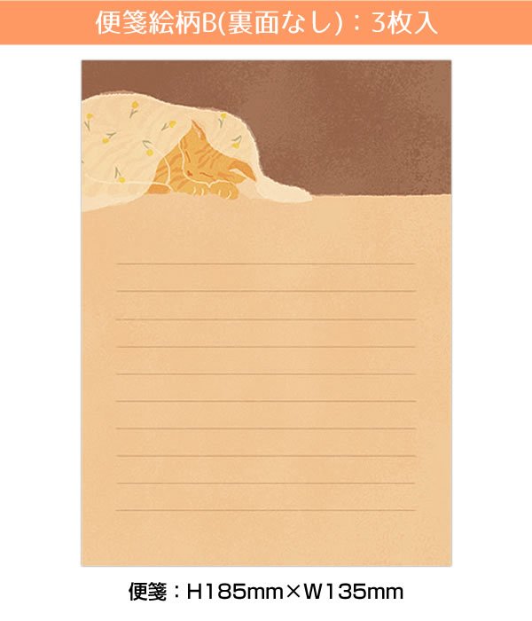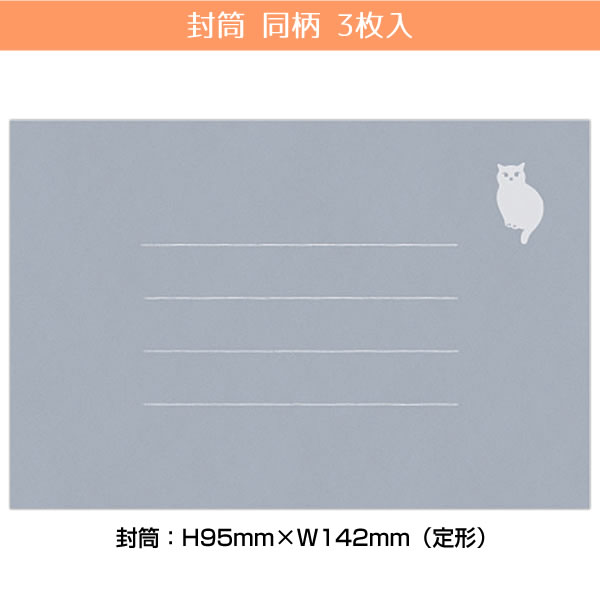 猫たちの愛らしい仕草が描かれた2種類の便箋入り。封筒には猫のワンポイントが入り、宛名欄も完備されています。大切な人へ、日々の想いを綴るのにぴったりのセットです。