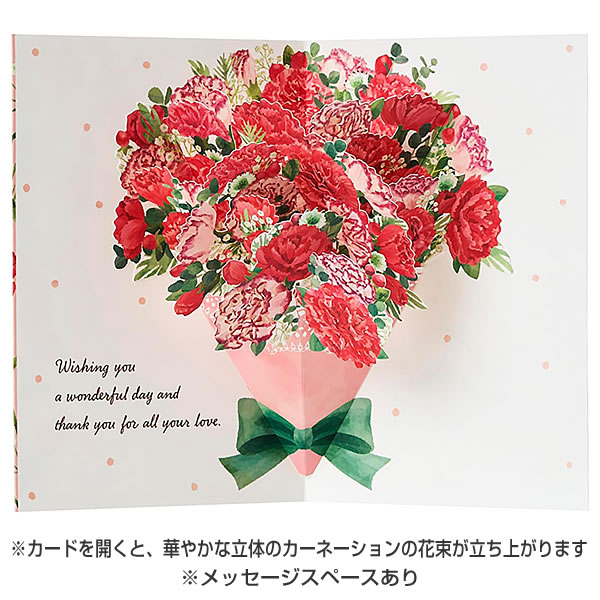 カードを開くと、華やかな立体のカーネーションの花束が立ち上がります。