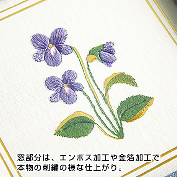窓部分の花刺しゅうの印刷には、刺しゅうの立体感を表現した加工や金箔加工が施されています。