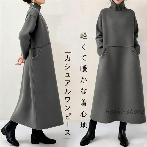 ワンピースレディース秋冬 ハイネック ニット ツイード風 切り替え ミモレ丈ワンピース ゆったり 体型カバー 大人きれいめ プルオーバー Aラインワンピース