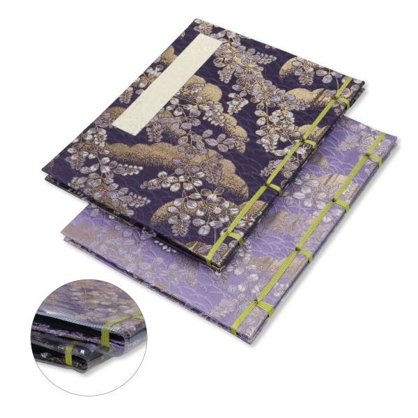 ・表紙は紫式部が着用している十二単の着物「萩の柄」をイメージしたデザインの美しい金襴生地で装丁されています。