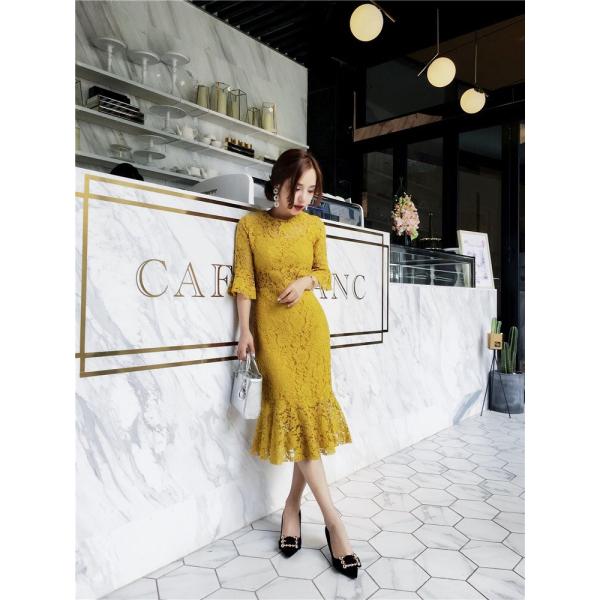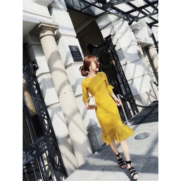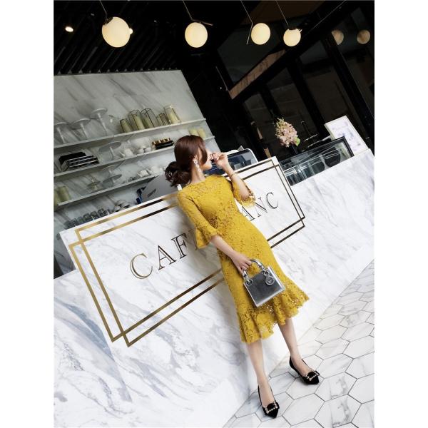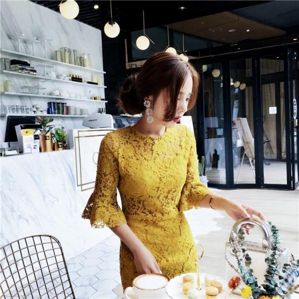 レース花柄ワンピース 丸ネックラッパ袖透 膝丈 宴会レース 結婚式 二次会 春 夏 7分袖 Uネック