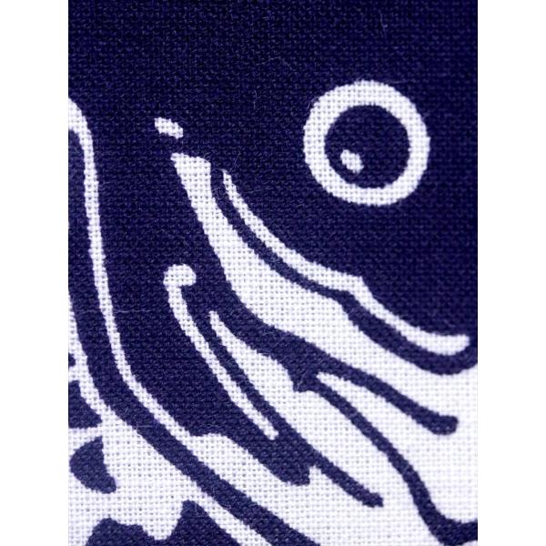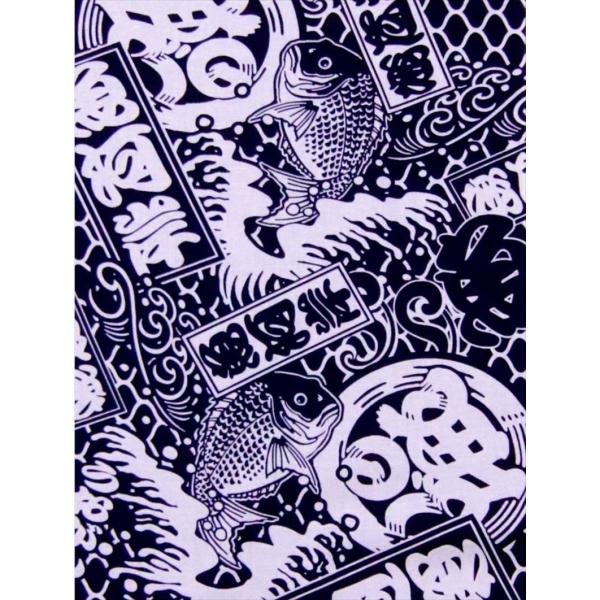魚河岸柄の生地です。綿100%・長さ90cm以上・巾35cm・捺染(片面染め)・平織り・耳あり・浜松産。カバー類・バック類・インテリア・シャツ(4,5枚あわせて)・のれん(2,3枚あわせて)・パッチワーク・袋物・ペットの服・座布団カバー・民芸品等のハンドメイド・手芸の材料などにご利用ください。地色は濃紺地です。