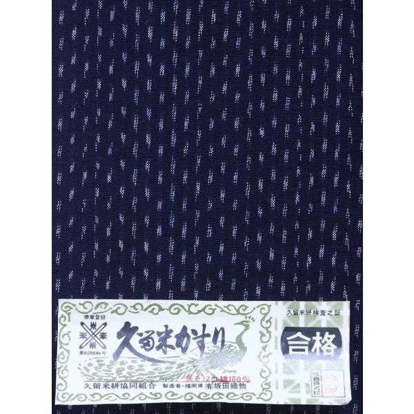 久留米絣・綿のキモノ生地・反物・未仕立て品・綿100%・長さ12.5m・巾39.5cm(クインサイズ)・両面同柄織り・耳アリ・地色は濃紺地です・福岡県産。綿の着物・洋装・モンペ・インテリア・のれん・民芸品・和雑貨・袋物・カバー類等の手芸の材料としてご利用下さい。お手元に届きまして、イメージと違うようでしたら、裁断される前に至急ご返送ください。