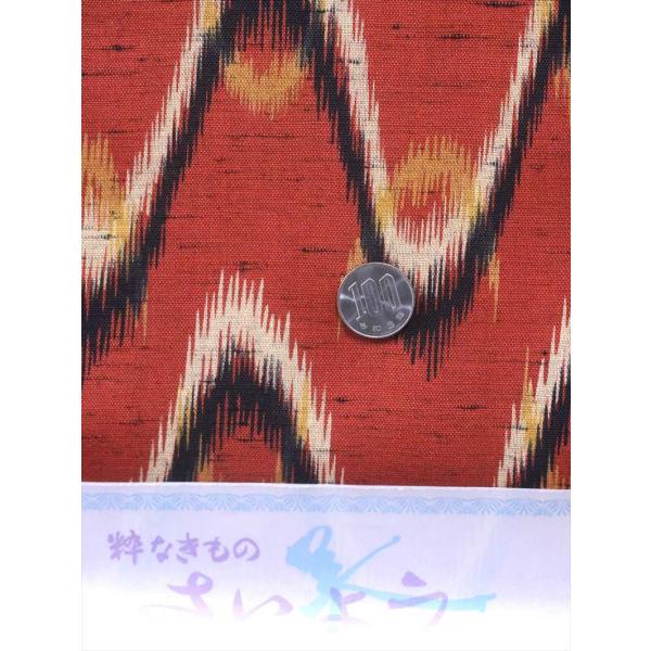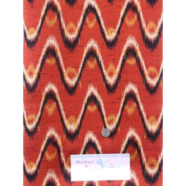 ウール・着物・反物・未仕立て品・毛96%/ナイロン4%・長さ11.5m・巾35.5cm・捺染(片面染め)・変わり織り(所々に黒の節糸が入ってます・拡大写真参照)・耳有り・浜松産。着物・はんてん・道中着・インテリア・小物・袋物等の手芸の材料にご利用ください。お手元に届きまして、イメージと違うようでしたら、裁断される前に至急ご返送ください。織り柄のように見えますがすべて片面染めです。