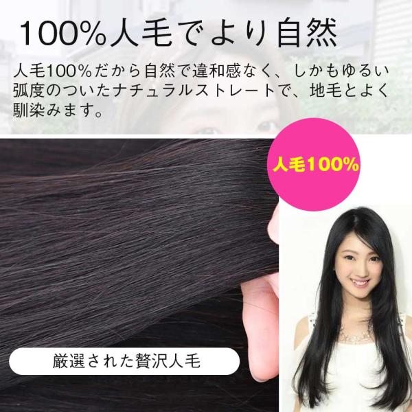 ●人毛100%だから自然で違和感なく、しかもゆるい弧度のついたナチュラルストレートで、地毛とよく馴染みます。