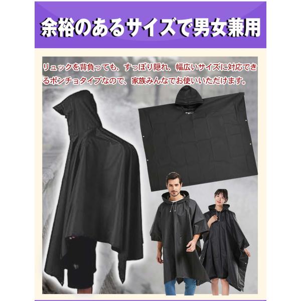 ●リュックを背負っても、すっぽり隠れ、幅広いサイズに対応できるポンチョタイプなので、家族みんなでお使いいただけます。