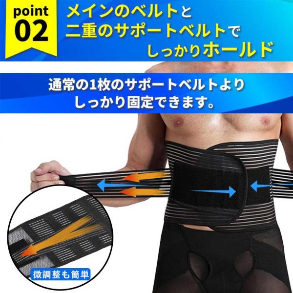 ●伸縮性がいいのダブルベルトで着用時でもずれにくく、着用したまま簡単に締め付け加減を微調整できます。繰り返しの仕様に対応した高耐久性素材のマジックテープ腰サポーターなので、装着も簡単です。