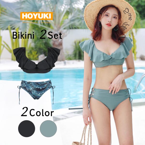 水着 レディース ビキニ セパレート レースアップ リボン 袖あり 体型カバー 可愛い 韓国 フリル S/M/L