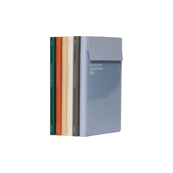 表紙に蓋付きポケットを備えたイーリス。表紙のグラフィックはシンプルに、カバーと同色で落ち着いた印象。付箋やシールなど文具の収納はもちろん、差し紙を変えてカスタマイズも楽しめます。