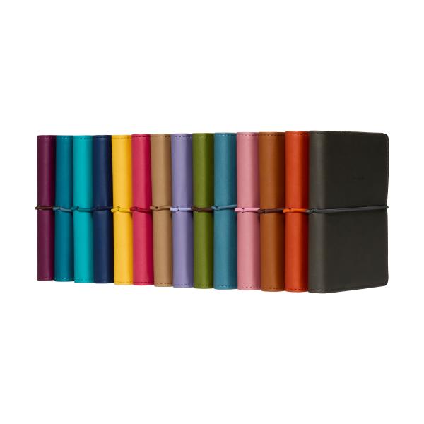 なめらかな質感のPU生地を使用した、ゴムバンド付きダイアリーです。裏地は生地を合わせて強度も上げています。ゴムバンドが付いているので、かばんの中で中紙が折れたり、挟んでいる付箋やメモが飛び出る心配もありません。こちらは直営店限定のダイアリーです。 こちらは直営店限定のダイアリーです。