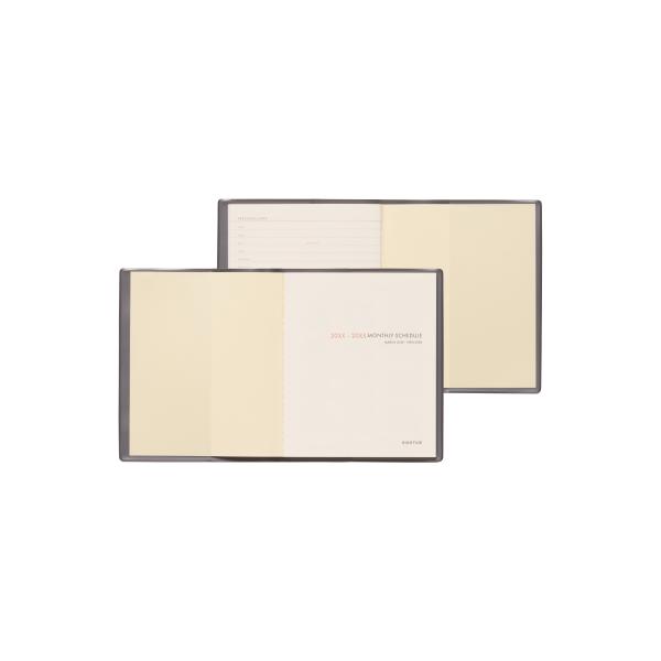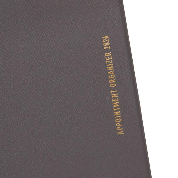 落ち着いたカラーリングのカバーに、ゴールド箔を施したフォーマルな印象のダイアリーです。PVC素材を使用し、ほどよいシボ感で手に馴染みます。直営店限定色はライトグレーです。