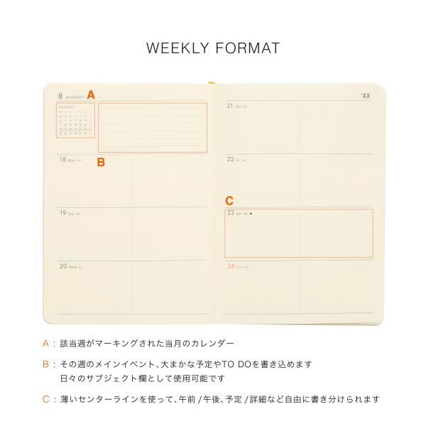 見開き一週間で、シンプルで見やすいレイアウト。1日のスペースを広く取っているので、ちょっとした日記帳感覚で使用できます。
