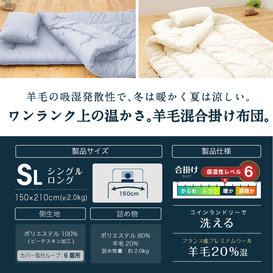 洗える!! 日本製羊毛混合掛布団 (シングルロング)羊毛/掛け布団/掛布団/シングルロング/清潔/洗濯OK/洗える/清潔/送料無料/羊毛肌掛布団/肌触りいい/涼しい/通気性抜群 【送料無料】日本製 羊毛混合掛け布団 羊ちゃん シングル ロング