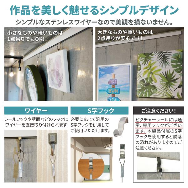 小さな絵は1点吊りで、大きな絵は2点吊りでご使用ください。ワイヤーには壁面フックやレールフックなどにひっかけてください。付属のS字固定具は長押などにひっかけ、ワイヤーをひっかけて頂くことが可能です。