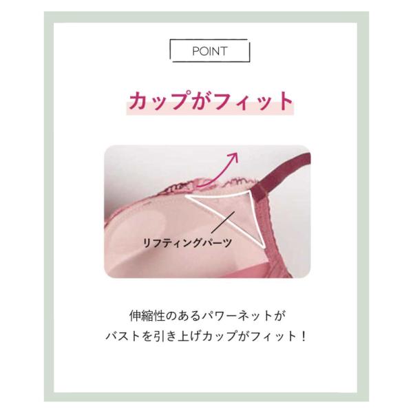 カップ脇の伸縮性のあるパワーネットがバストを引き上げ、カップがバストにフィット。