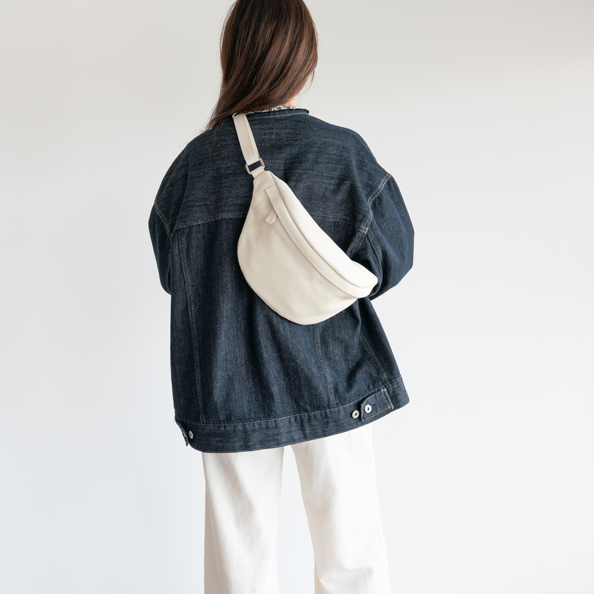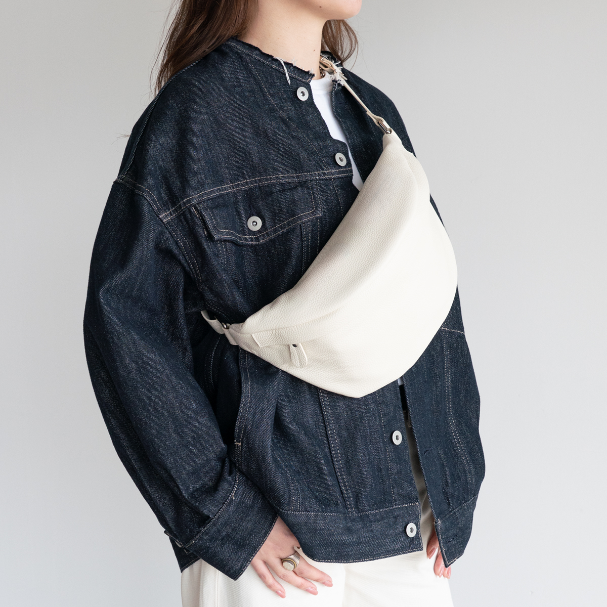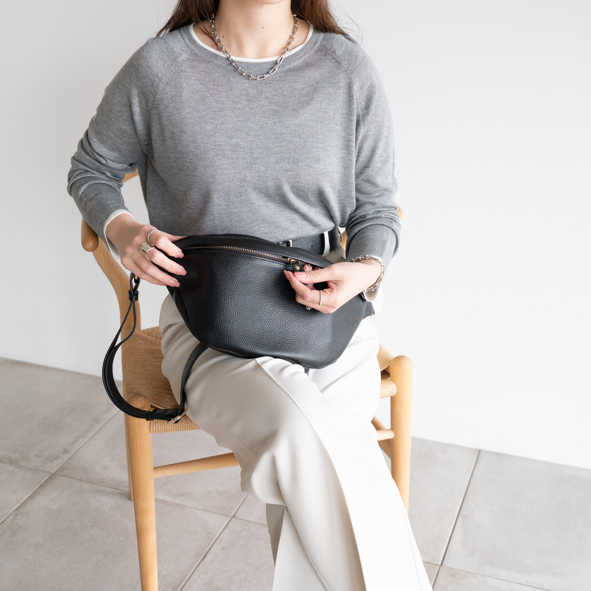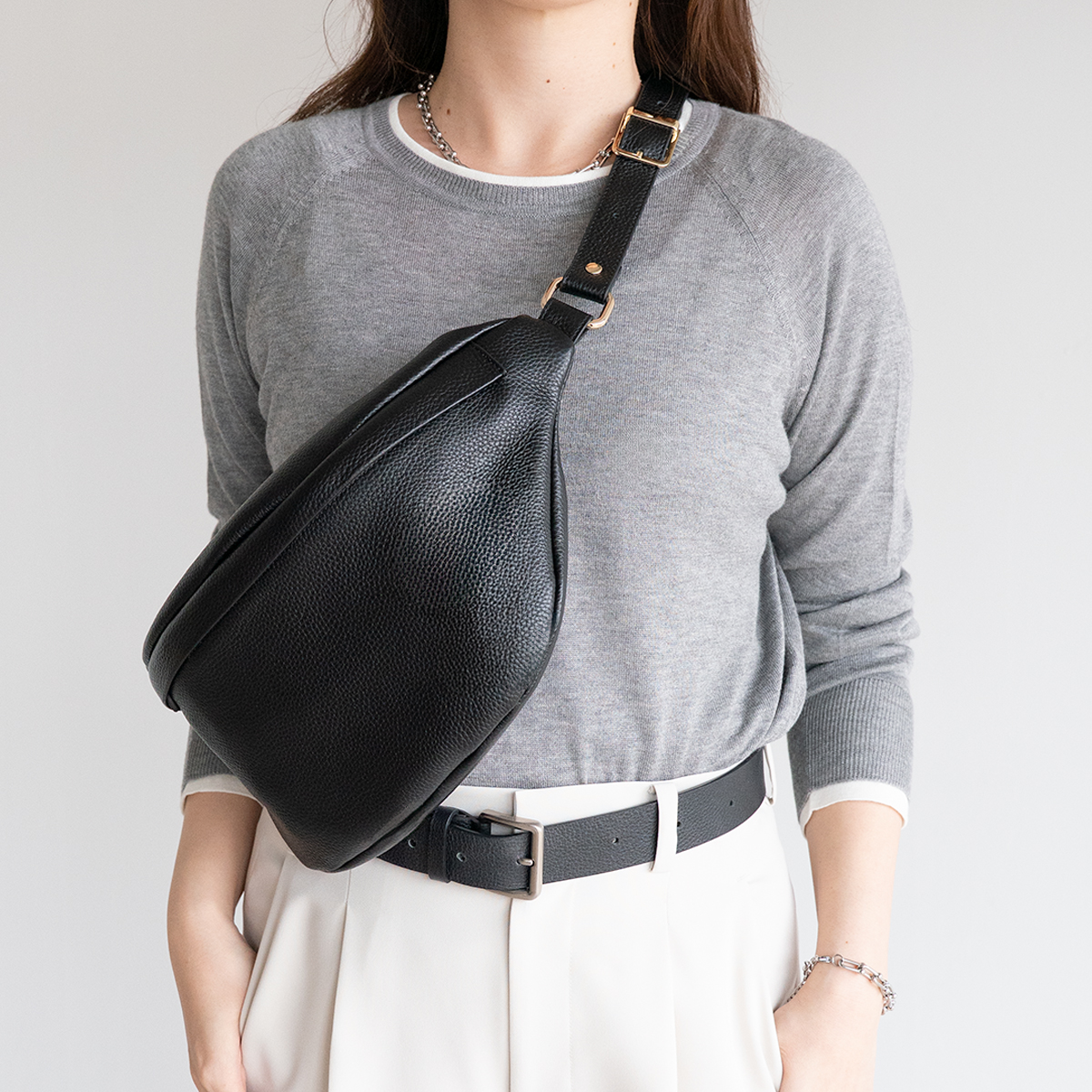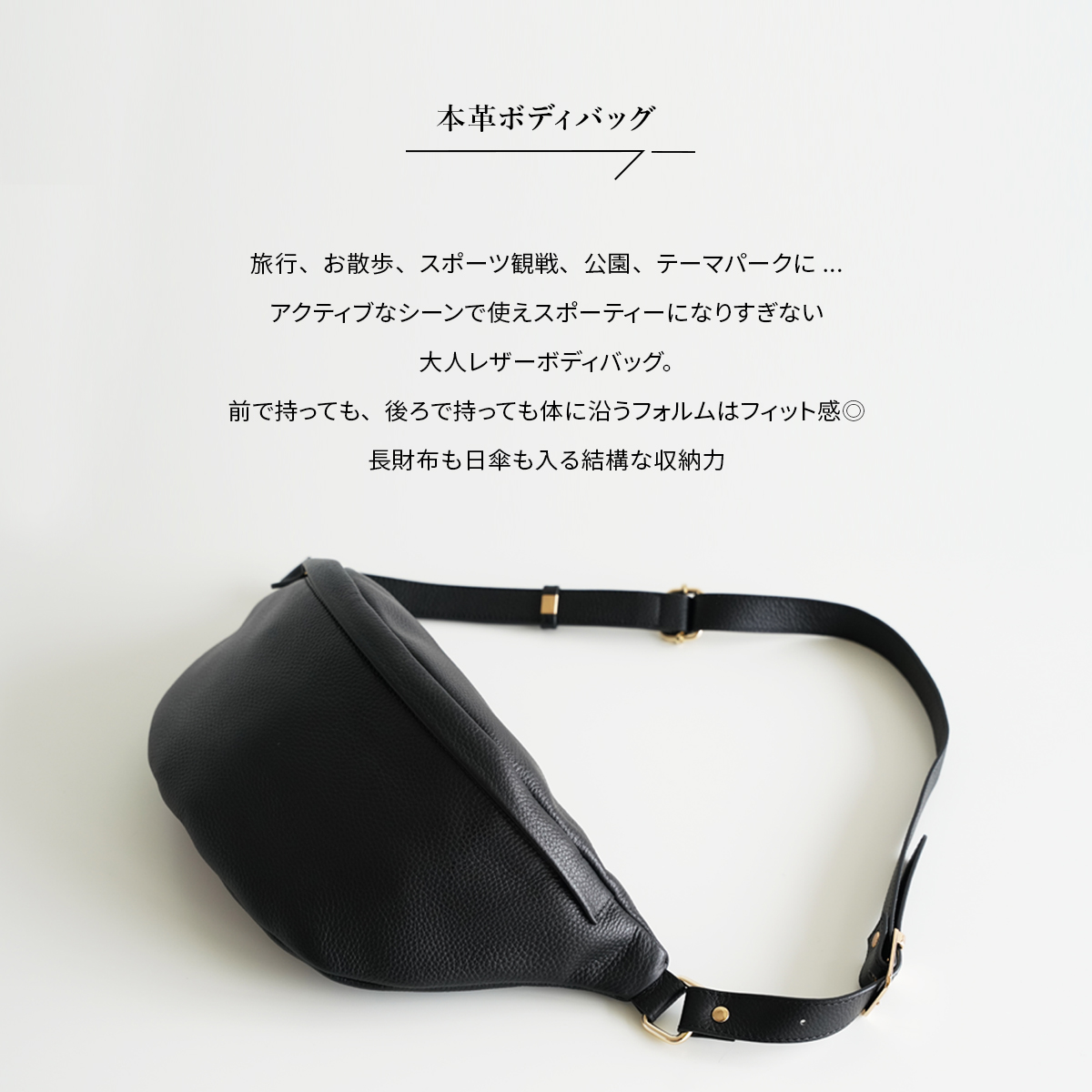 レザーのボディバッグ、体に沿うフォルムでアクティブに