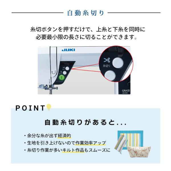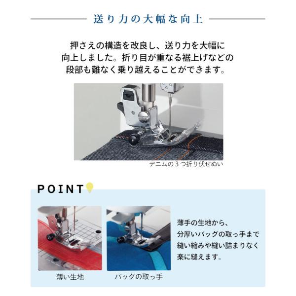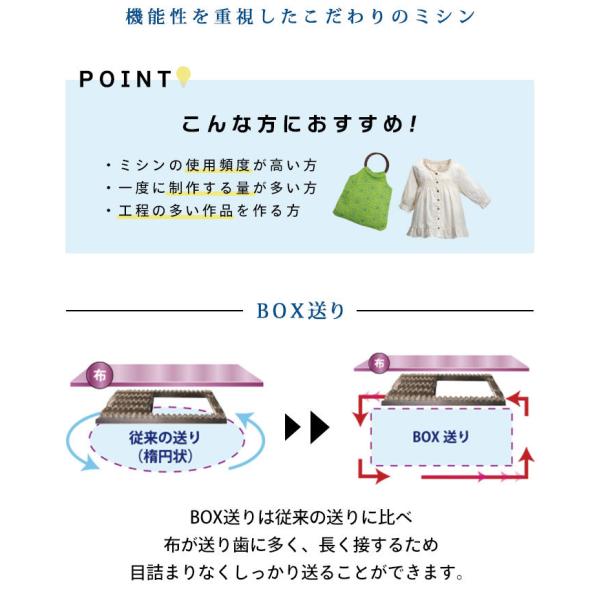 自動糸切り機能、下糸クイックセット機能、BOX送り機構、縫い模様20種類、大型液晶パネル、広いソーイングスペース、自動ボタンホール(レバー式)、かんたん自動糸通し機能、7枚送り歯、針停止位置切替機能、ドロップフィード、LEDライト、電源コードリール式、ハードケース