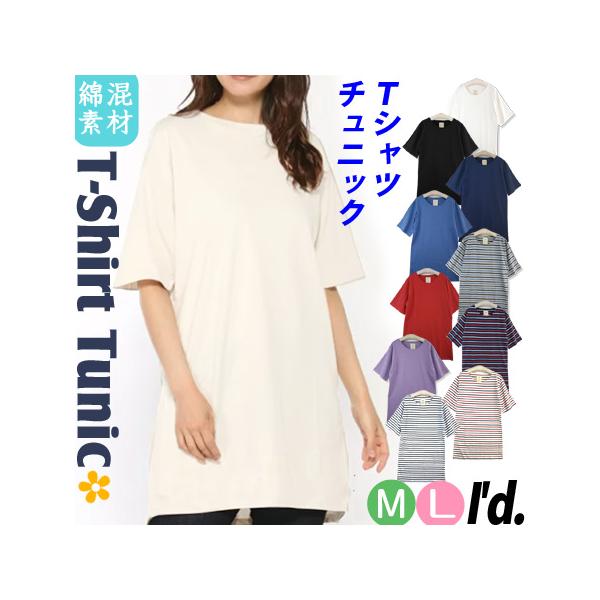 綿混 二の腕隠れる ロング丈 Tシャツ チュニック 五分袖 夏Tシャツ 半袖 カットソー 無地 ボーダー柄 ロングTシャツ 春夏 レディース M L 4967