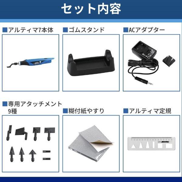 【商品説明】<BR>【特長】●力強いストロークで負荷が高くても止まらずに動き続け、作業効率がアップ●オートトルク機能搭載、ストロークサンダー、フィードバック機能をストロークサンダーに応用することにより、力強いストロークで作業効率が更にアップするだけでなく、負荷が強い木工等のヤスリ掛けも対応可能になりました。<BR>【用途】●樹脂、木工のやすり掛け<BR>【仕様】●全長(mm):187●往復回数(可変)(回/分):1000〜5000●振動数(回/分):1000〜5000●定格入力(VA):12 0.5A●電源(V):AC100〜240<BR>【仕様2】<BR>【材質/仕上】<BR>【セット内容/付属品】●アルティマ7本体●ゴムスタンド●ACアダプター●専用先端アタッチメント9種●糊付紙やすり#240 10枚●アルティマ定規<BR>【注意】