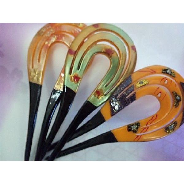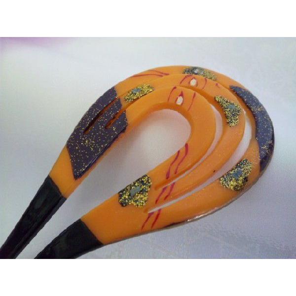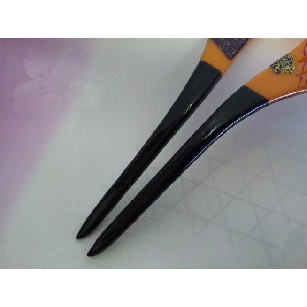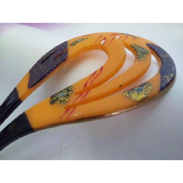 オレンジ色に、紫色の線と金色に輝く花模様のかんざしです。