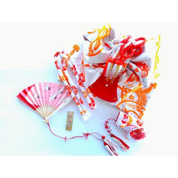 リサイクル品 結び帯(作り帯) 七五三 7才 女の子 白地銀朱赤 6点セット 985 ggp