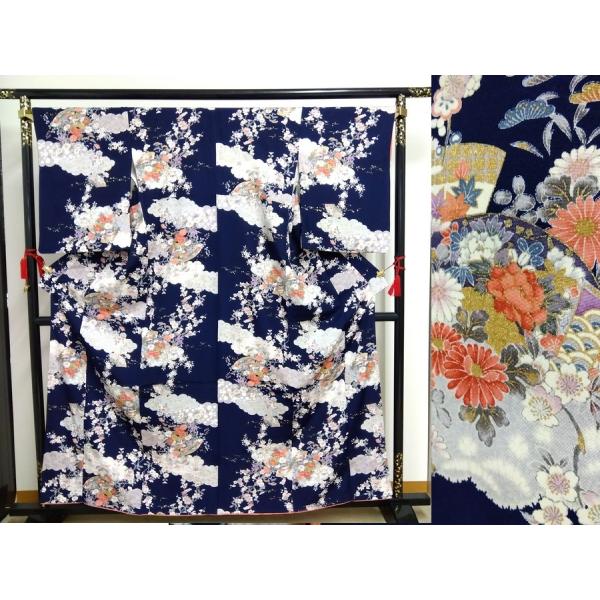 中古 リサイクル 正絹着物 袷 シルク 紺地に雲取り 四季草花 扇面 着丈158cm 955 ggp