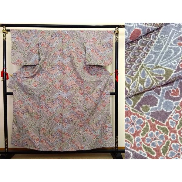 中古 リサイクル 洗える着物 単衣仕立て 化繊 ちりめん グレー短冊 着丈153.5cm 908 ggp
