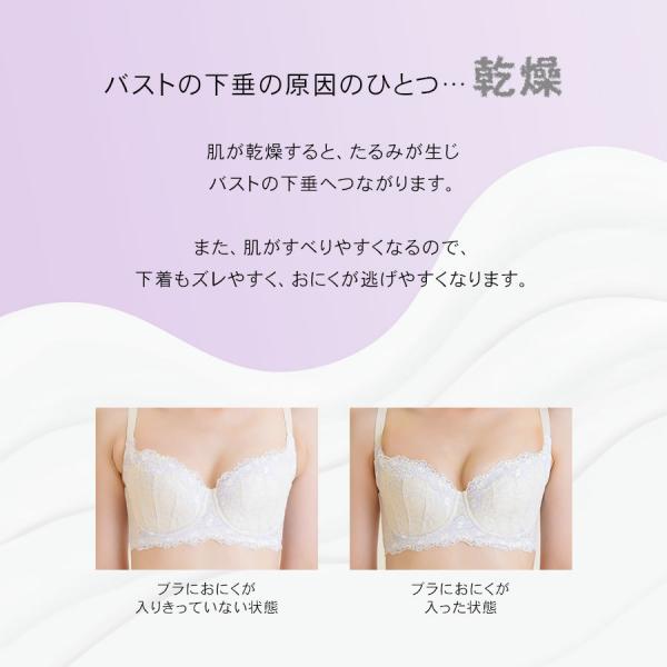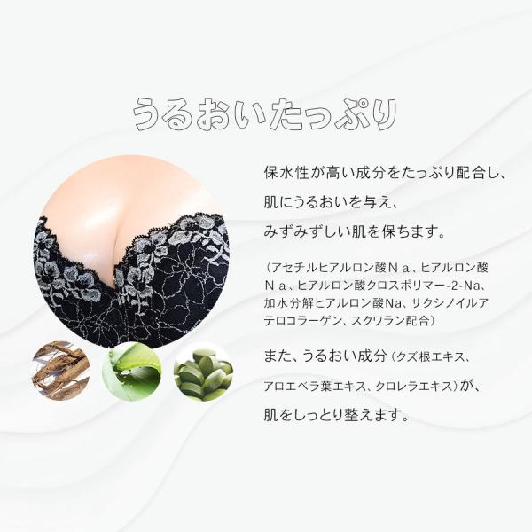 肌に吸い付くような濃厚なうるおいを与え、ブラジャーやガードルにおにくを入れやすくしたり、下着の摩擦による乾燥を防ぎ 密着度をUPしてズレにくくしてくれます。