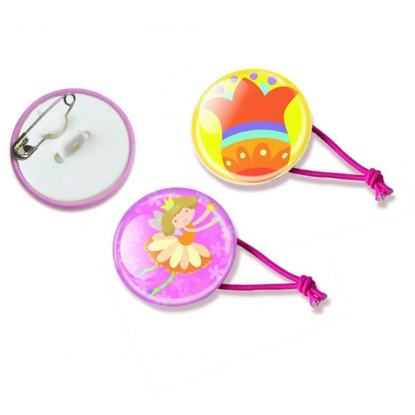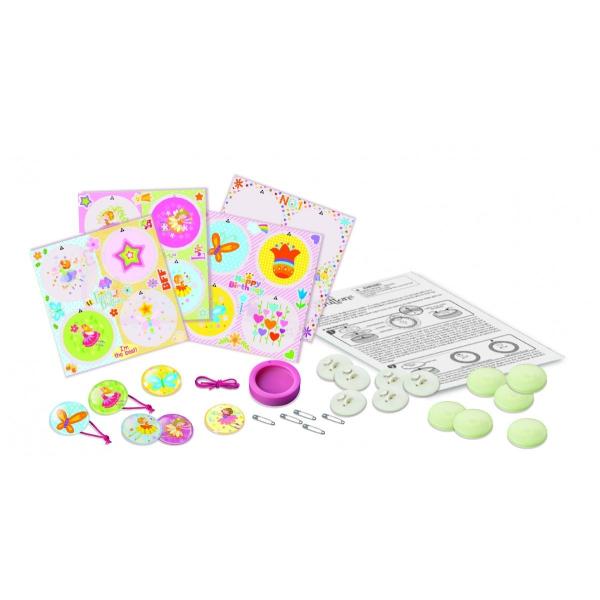 12種類のボタンアクセサリーを作るキットです。絵柄のついたシートをボタンにはめて、ドライヤーを当てるだけで完成!安全ピンでバッジのように使ったり、ひもを通してストラップにすることもできます。できあがったボタンは、光をしばらく当てておくと、暗いところで光ります。