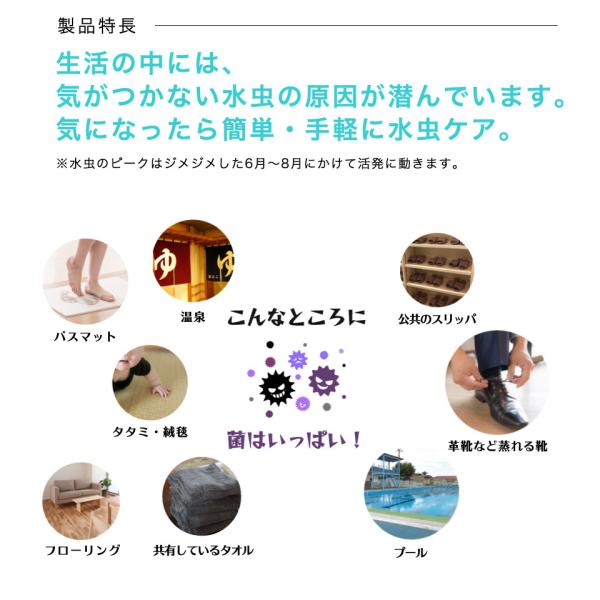 生活の中には気が付かない水虫の原因が潜んでおり、気になった時にいつでもどこでも簡単にケアできます。