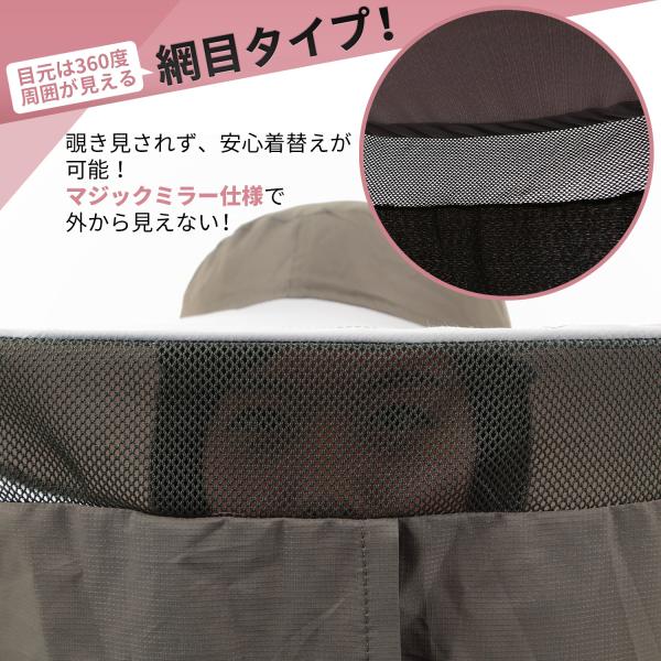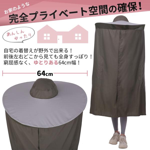 特徴:八の字の柔性ワイヤーを開閉して円状に広げて頭に被せるだけで簡易更衣室での着替えが可能。八の字に小さく畳めばコンパクト収納。防水効果もあり野外の雨天時、室内(屋内)も共にOK。フルマラソンやハーフマラソン大会の着替えで大活躍。サファーのサーフィン着替え、海水浴の生着替えにもOK。機能:太陽光の透けない遮光生地採用。日光による、着替え中に見えてしまうかもしれないという心配もありません。セクシャリティーな問題にも気にせず、マラソンスタイルに着替えられるのは大きなメリットです。 また、首元がゴム仕様になっているのと生地面積も広いので「すぐに着替えやすい」「腕をゆとりをもって広げられるので脱着がラクだった」「着替えの心配がなくなったので集中してマラソン大会に挑めた」など、たくさんの「安心して利用できた」というお声をいただいております。使用例:マラソンやサーフィン、海水浴、アウトドアや登山は勿論、災害時の目隠し着替え用テント、簡易着替えにも使用可。完全個室の着替えとしてポップアップテント同等、着替え用ポンチョとして使えます。またコスプレ着替えやハロウィン、仮装、ダンス、早着替え衣装もOKです。