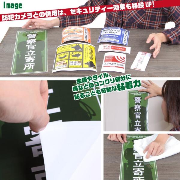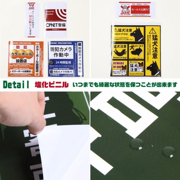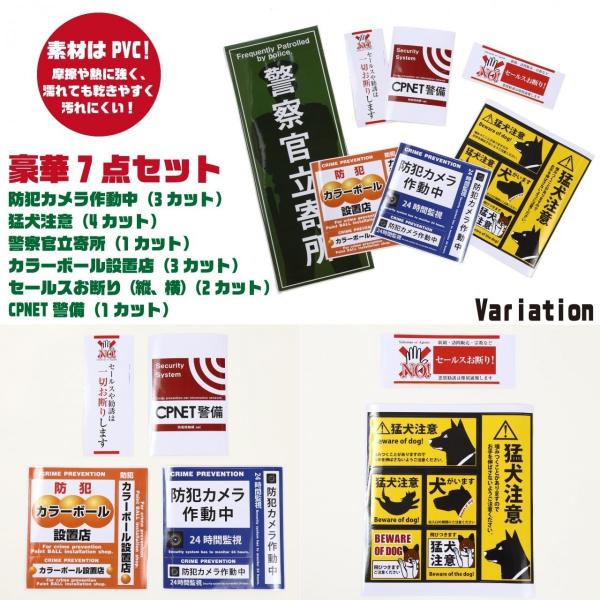 (種類)「防犯カメラ作動中(3カット)」「猛犬注意(4カット)」「警察官立寄所(1カット)」「カラーボール設置店(3カット)」「セールスお断り(縦、横)(2カット)」「CPNET警備(1カット)」の豪華7点よりお選びいただけます。(素材)ポリ塩化ビニル(PVC)で、防水性に優れ、強度や摩耗に非常に強く、高い耐熱性もあります。濡れても乾きやすいので汚れにくく、屋内野外問わず、光沢ある綺麗な状態を保つことが出来ます。(使用事例)夜間誰もいないオフィスの入口や小売業の店先、倉庫のシャッター部分やご自宅の玄関先やインターフォンの近くにも、7点ある防犯ステッカーから用途に応じて一番効果的なステッカーを貼ることで警鐘を鳴らし、犯罪抑止につながります。(ご検討中のお客様へ)高いデザイン性も他社様と比較すれば一目瞭然!数ある防犯ステッカーから犯罪抑止に効果がある厳選した7点を商品化しております。量販店との差別化、セキュリティー会社にもひけをとらない存在力は当社だけでございます。