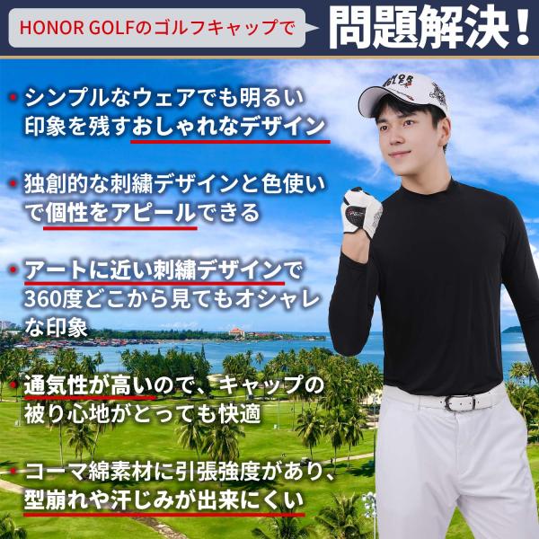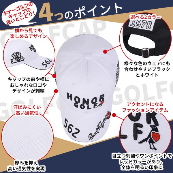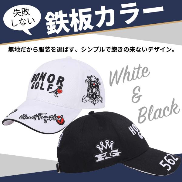 【HONOR GOLFのゴルフキャップ】男女問わずお使い頂けるシックでクラシックなデザインです。クラウン外側360度にわたってブランドロゴや刺繍が施されています。どこから見てもカッコいい仕上がりです。【高級感の刺繍ロゴ】前面は「HONOR GOLF」刺繍、サイドはブランド名「HONOR(名誉)」から連想される王冠をテーマとしたエンブレムデザインです。後面はブランド創立年である「1978」のワッペンをデザインしています。ツバの部分には「Great Frigatebird」のスタイリッシュな表記に加えて、「562」の数字が、遊び心あるイメージを与えます。さらに、ゴルフボールやハートマークにワンポイントで入る赤色が中毒性のあるオシャレを演出します。【ラウンド中に際立つ装飾】一つ一つのデザインとしては、全体的に見ますと、プロが試合で着用するような、お洒落な作りです。初心者からベテラン層までの男性ゴルファーにオススメな商品です。【生地100%に「コーマ綿」】という高級素材を使用しております。コーマ綿は、通常の綿や糸と異なり、繊維が細く、長さが均一作られているのが特徴です。とても滑らかな被り心地、装着時のフィット感が強い。しっかり馴染んでくれます。