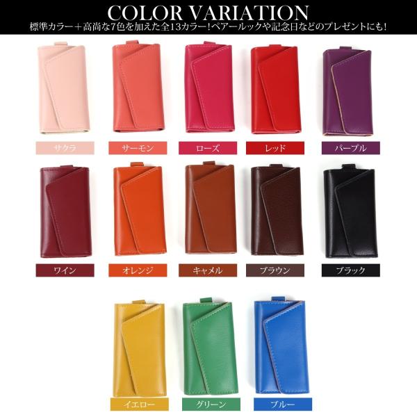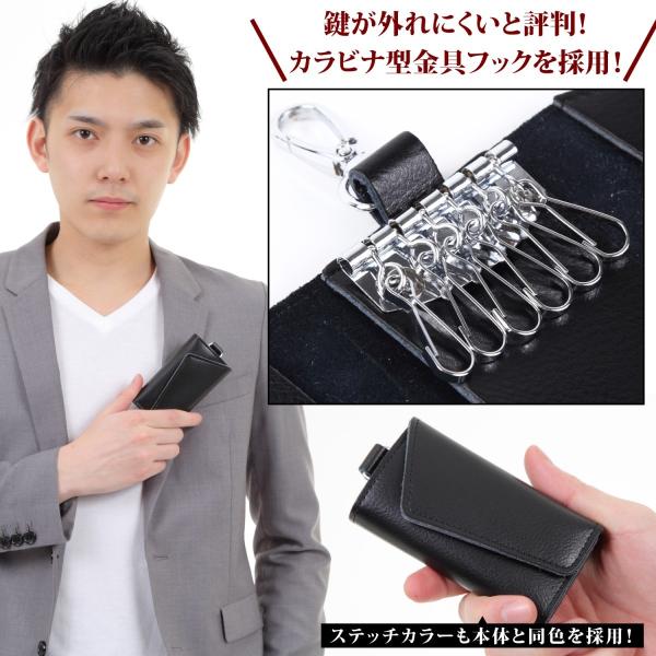 本革の革は上質なレザー(皮)を使った最高グレード仕様です。女性(レディース)や男性(メンズ)、子供(ランドセルや腰にも取り付け可能)から大人まで通勤通学、アウトドアなど幅広くお使い頂けます。6連リングのコンパクト仕様でスマートキーやカードキー、リモコンキーにエンジンスターターまで収納が可能(取り外しも可能)です。財布の女房役として札入れや定期入れ、パスケースとして小銭や各種カード類も収納出来ます。キーケース先端には、ナスカンフック付きで金具のグレードも高く、多機能です。ラウンドファスナーやチャック式と異なり、三つ折りキーケースは、オシャレでかわいいイメージがあり、好感度もアップします。三つ折りですので、電波遮断の効果もあります。彼女や彼氏、夫婦とペアでお揃いで合わせたり、プレゼント(贈り物)にも適したkeycaseです。トヨタやホンダ、日産やスズキなどの国内自動車メーカー、BMWやベンツなどの高級外車にも上質本革の質感と非常にマッチします。シルバー6連フック式金具にメインキー金具があり、全部で7つの鍵を収納することが出来る贅沢な仕様です。革本来の柔らかさと手触りを感じて見てください。