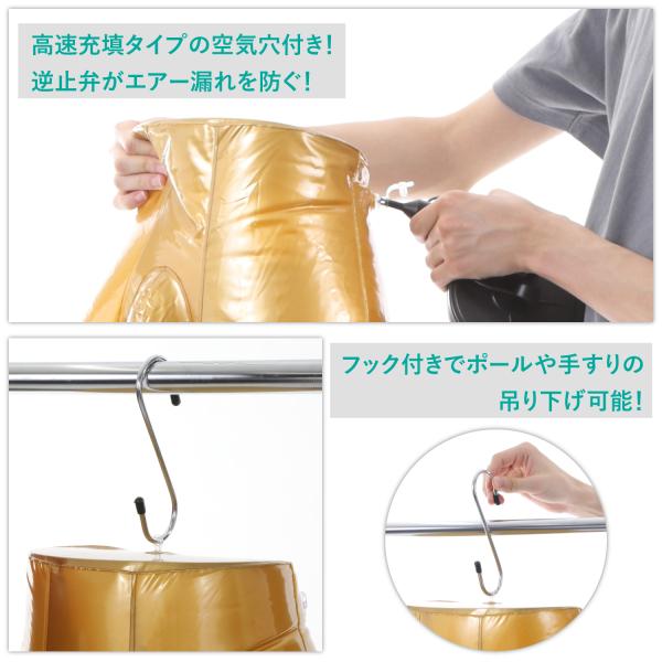 PVC製エアーマネキン(金色 ゴールド)です。高密度ビニールのような上質素材で出来た空気で膨らませるエアートルソーマネキンです。形状のラインナップも全身や上半身、下半身に頭や腰、足、パンツやボディなどの各部位まで全て揃っており、メンズ(男性)、レディース(女性)も選択可能です。日本人体型をベースに日本のモデルスタイルを意識したリアルで実用的なマネキントルソーです。膨らませ方も簡単でお口で膨らますことも可能、空気入れが尚早く、すぐに100%の空気量に到達します。使い方も自立やポール立てのディスプレイ、ハンガーフックに引っ掛けての展示や天井からの吊り下げにも適しています。商品ページや販売サイトへの掲載や撮影にもとても便利です。従来の樹脂製と比較しても非常に軽量で上着やジャケット、ジーンズなどの重量物も強力フックが耐荷重をガッチリ支えて落下の心配や危険もありません。当社ではとにかく目に付く、高級感の色味をモットーにゴールドカラー(金色)を開発しております。より洋服の魅力を訴求しやすく、お客様が実際に着用したイメージを伝えるのにゴールド(金色)はオススメです。