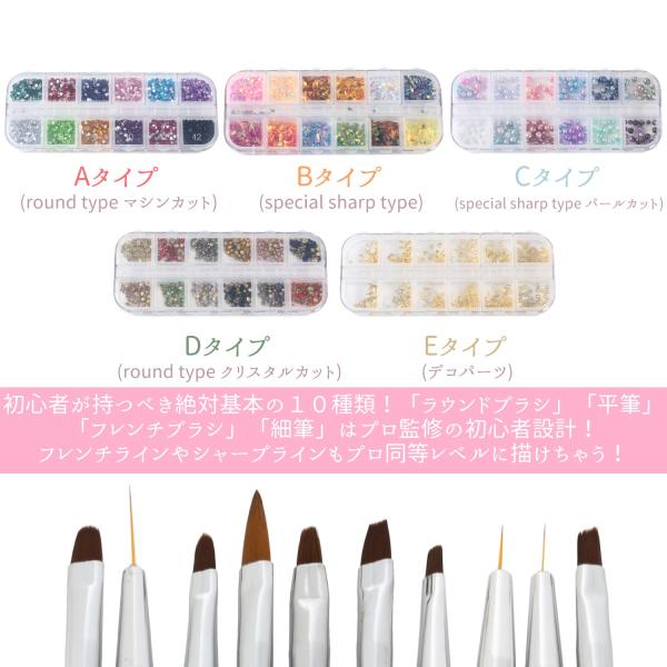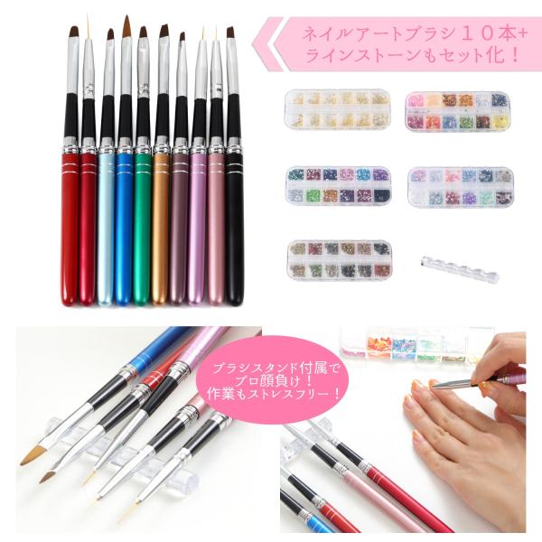 ネイルアートブラシ10本に加えてラインストーンは使用しやすいラウンド2mmを12色セット化しております。ブラシスタンドも付属で必要な道具は全て揃っております。