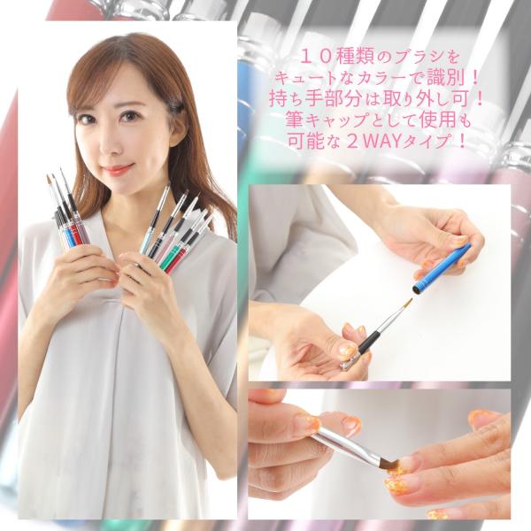 ネイルアートをしている際に取り間違えないように10本を10種類のパステルカラーで識別しております。持ち手部分は取り外せば、キャップとして筆をカバー出来ます。