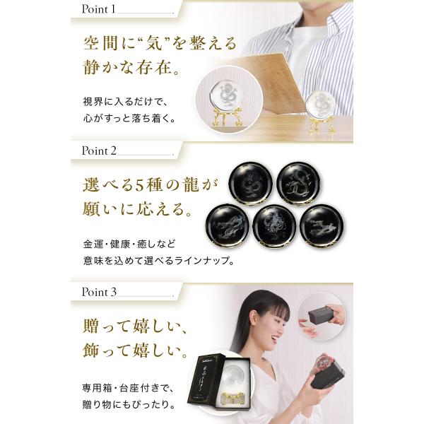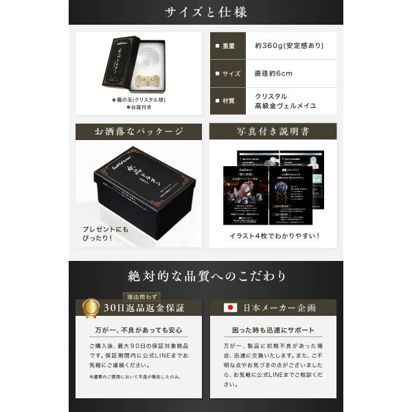 【仕様とセット内容】水晶龍の置物(台座付き):龍の玉は、全5種類(昇り龍 白龍 金龍 海龍 幻想龍)。クリスタルサイズ:直径60mmのクリスタル水晶玉。 台座:高級ヴェルメイユ仕上げ(金色の豪華デザイン)。パッケージ:ギフトや贈り物(プレゼント)にオシャレな化粧箱入り。