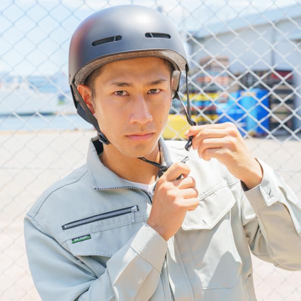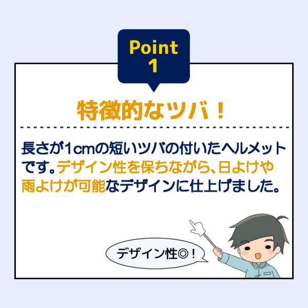 ツバを1cmほどに短くした新しいデザインのヘルメットです。デザイン性を保ちながら、ツバが日よけや雨よけに役立ちます。