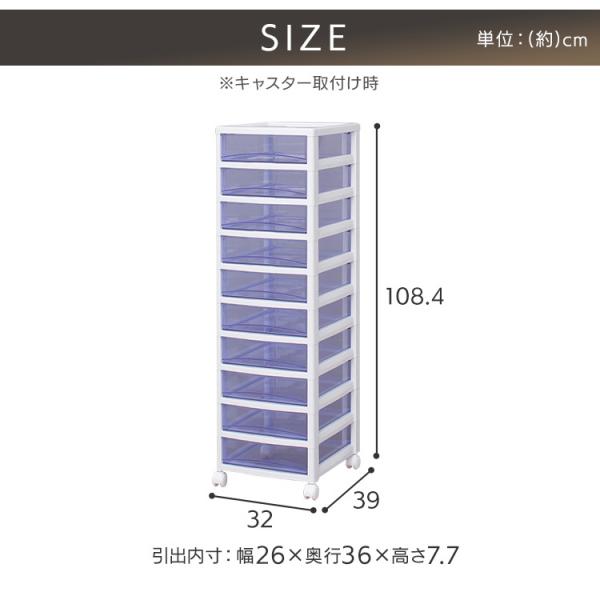透明度の高い材質を使用し、中身が確認しやすいクリアタイプのチェストです。引出は飛び出しにくい構造になっています。移動に便利なキャスター付き。