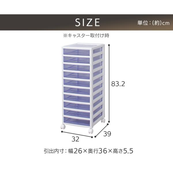透明度の高い材質を使用し、中身が確認しやすいクリアタイプのチェストです。引出は飛び出しにくい構造になっています。移動に便利なキャスター付き。