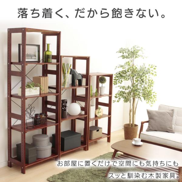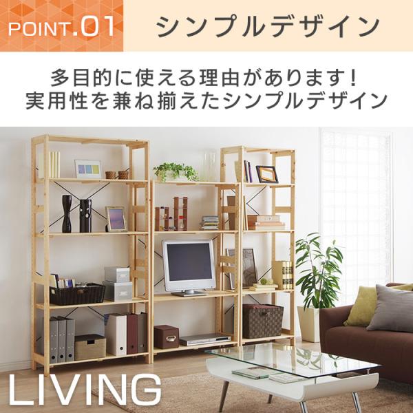 天然木を使用したナチュラルテイストの木製オープンラックです。棚板の追加や水平連結も可能です。また、棚板の高さは収納物に合わせて約3.2cm間隔で調節できます。床の傷付きを防ぐフェルト4枚(脚4本分)と補強用のクロスバー(1本)が付いています。