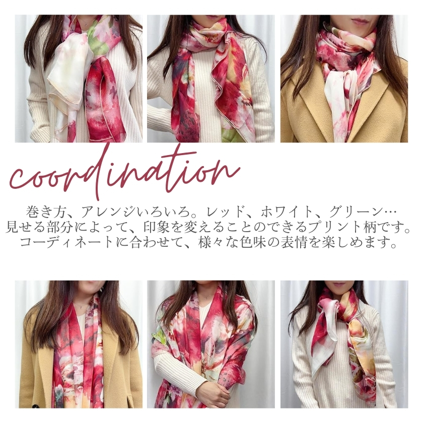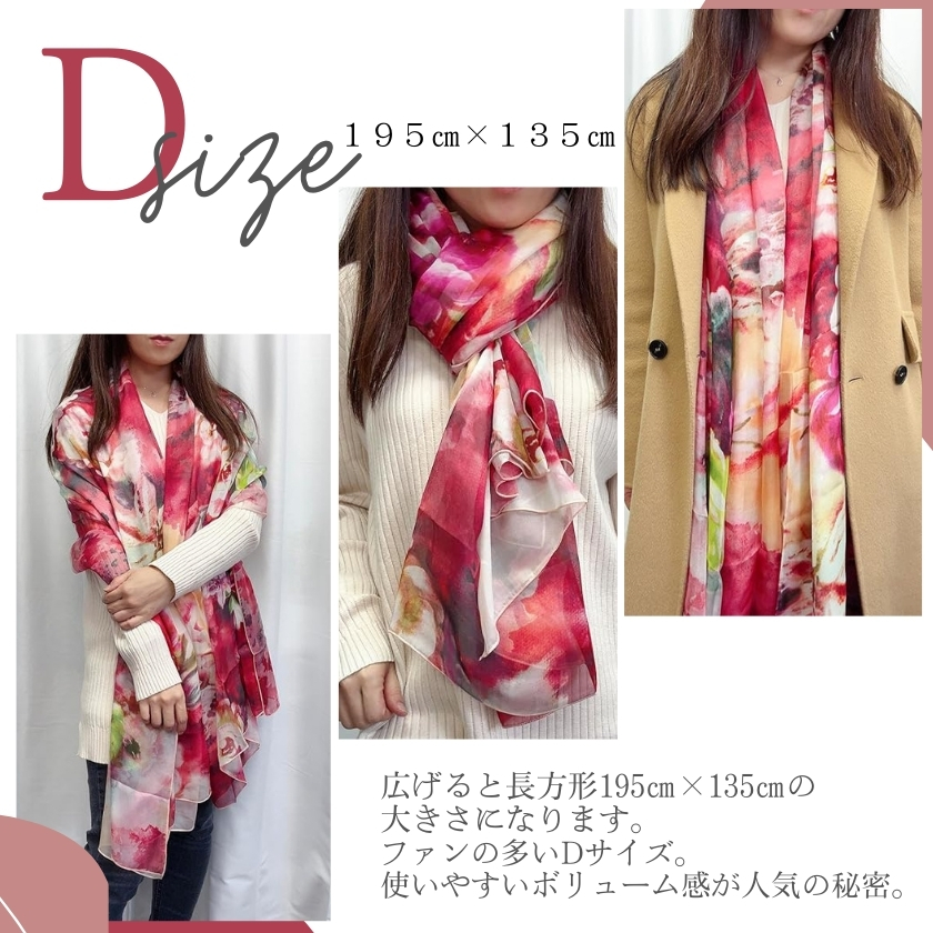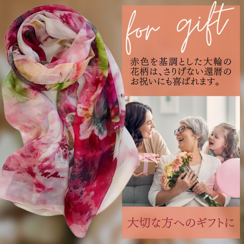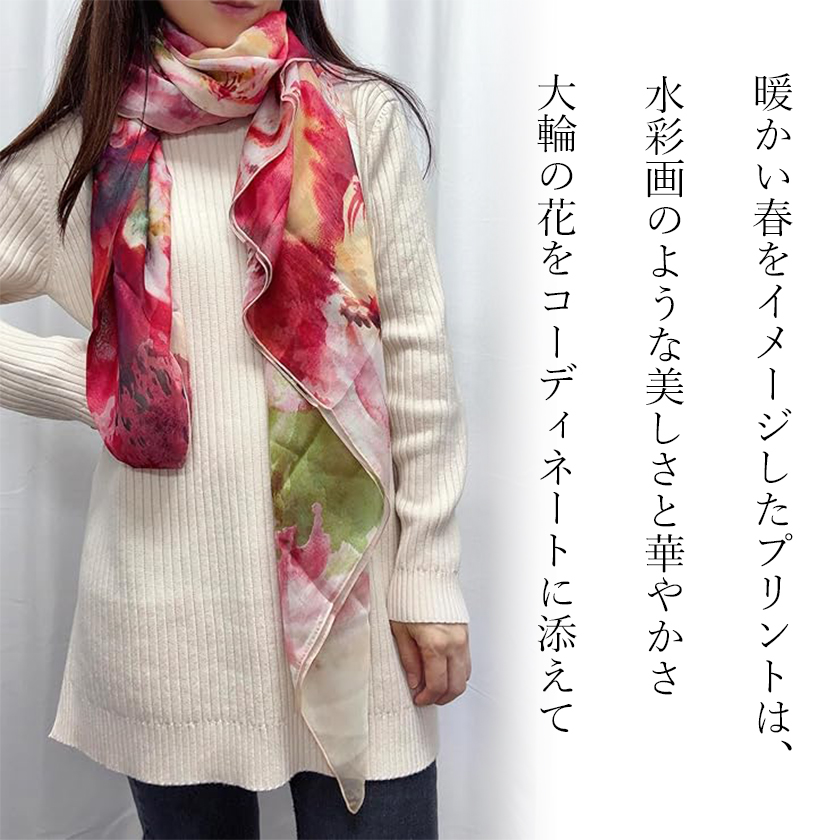 スカーフ レディース ストール シルク100% 暖春 花 ピンク ローズ 花束 フラワー ブーケ 大判 シフォン インスタイルジャパン